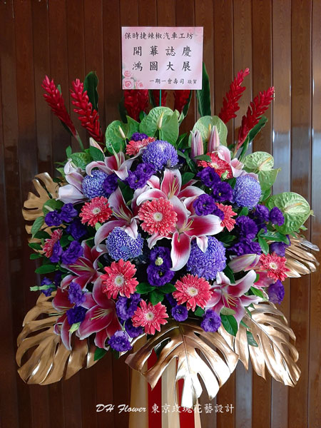 《 使用花材 》主花~紫牡丹菊,紅色百合, 配花~紅薑花, 綠火鶴,桔梗,太陽花