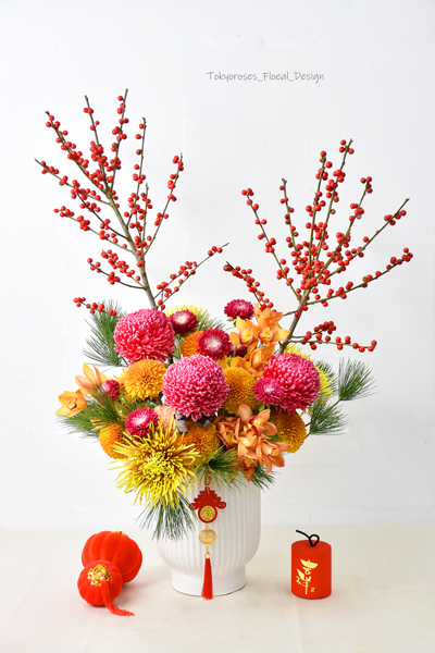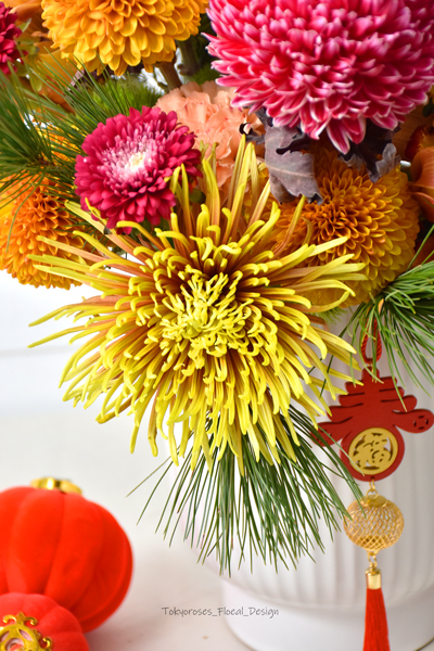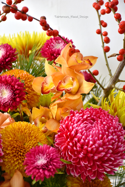 《 使用花材 》 冬青,橘小東亞蘭, 牡丹菊, 煙火菊, 金乒乓菊, 康乃馨 ;紅雲南菊,五葉松等