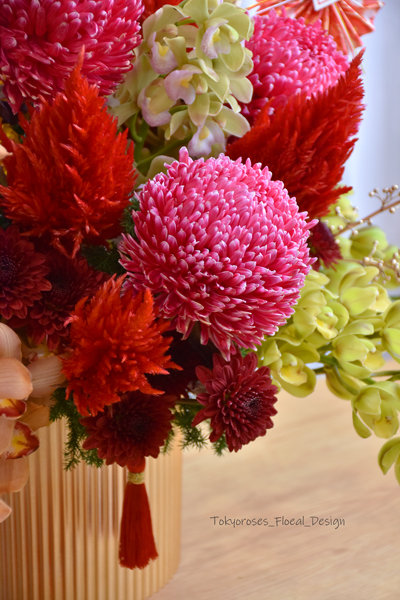 《 使用花材》 貝殼花, 橘小東亞蘭, 牡丹菊, 煙火菊, 鳳尾雞冠, 紅棒棒菊, 金人心木等