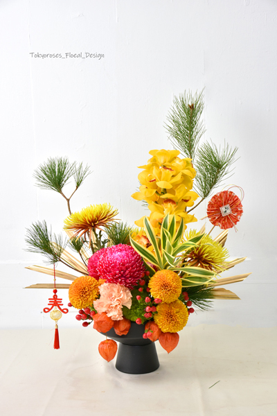《 使用花材 》 黃東亞蘭, 牡丹菊, 金乒乓菊, 黃金菊, 火龍果, 大宮燈 ; 金棕竹葉等